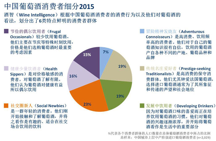 針對(duì)中國(guó)的3800萬(wàn)進(jìn)口葡萄酒消費(fèi)者,酒智(Wine Intelligence)劃分出了6類特點(diǎn)鮮明的消費(fèi)者類別。除了上述提及的 “發(fā)展中飲用者”(Developing Drinkers),其他5類包括“冒險(xiǎn)精神發(fā)燒友”(Adventurous Connoisseurs)、“傳統(tǒng)名莊愛好者”(Prestige-seeking Traditionalists)、“社交圈新人”(Social Newbies)、“健康少量飲酒者”(Health Sippers)和“節(jié)儉的偶爾飲用者”(Frugal Occasionals)。酒智(Wine Intelligence)的消費(fèi)者劃分不僅基于年齡、性別和收入等基本信息,還涉及消費(fèi)者的購(gòu)買飲用行為以及他們對(duì)于葡萄酒的看法,包括:他們?yōu)楹物嬘闷咸丫?,如何做出?gòu)買決定,以及飲用何種葡萄品種和產(chǎn)地等等。
