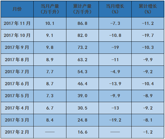 據(jù)國家統(tǒng)計局發(fā)布的最新數(shù)據(jù)顯示,2016年,全國葡萄酒產(chǎn)量達113.7萬千升。2017年全國葡萄酒產(chǎn)量達100.1萬千升,比2016年減少13.6萬千升,同比下滑12%。2017年1-11月,全國葡萄酒產(chǎn)量達86.8萬千升,同比下滑11.2%,而12月,全國葡萄酒產(chǎn)量達暴增至16.1萬千升,同比增長23.8%。