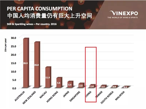 Vinexpo和IWSR對當前至2021年全球葡萄酒市場的預測報告稱,2021年中國葡萄酒消費量將趕超英國,增長39.97%,屆時中國的人均消費量將達到1.6升。