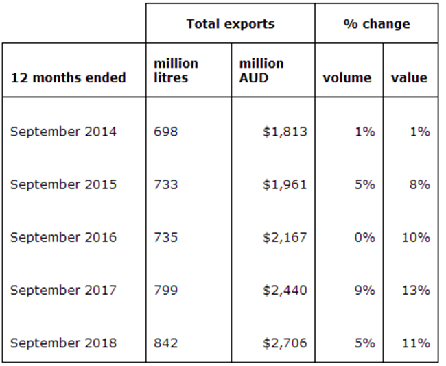 澳大利亞葡萄酒對(duì)全球出口額和出口總量持續(xù)走強(qiáng)。截止到2018年9月30日的一年中,澳大利亞葡萄酒出口總額增長(zhǎng)11%至27.1億澳元,出口總量增長(zhǎng)5%至8.42億升(或900萬箱9升裝,見表2)。
