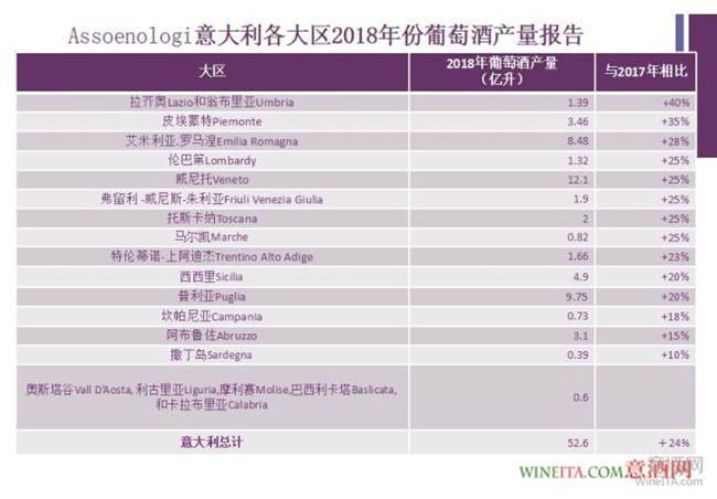 11月中旬,隨著意大利全境葡萄采摘季結(jié)束,意大利釀酒師及釀酒技術(shù)協(xié)會(huì)(Assoenologi)公布了關(guān)于2018年份意大利葡萄酒的產(chǎn)量報(bào)告?;谝獯罄r(nóng)業(yè)部的官方數(shù)據(jù),該報(bào)告做出結(jié)論:2018年,意大利葡萄酒及葡萄汁產(chǎn)量將比2017年份增長(zhǎng)24%,將達(dá)到52.6億升。今年意大利葡萄酒產(chǎn)量的實(shí)際增幅超越了8月末曾發(fā)布的產(chǎn)量預(yù)告,整體形勢(shì)較為樂(lè)觀。