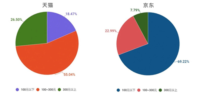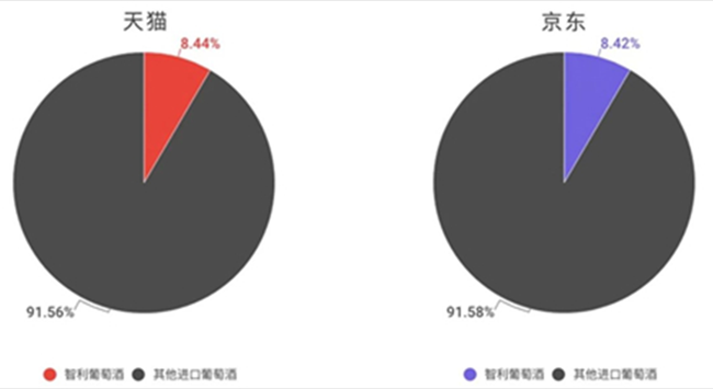 在天貓和京東兩大電商平臺上,智利葡萄酒的酒款數(shù)量占比均為8.4%,非常一致;此外,兩大平臺不同價位的智利葡萄酒分布也相對接近──低端智利酒的占比略低,而中高端的酒款數(shù)量比起意大利等競爭對手來說則明顯占比更高。