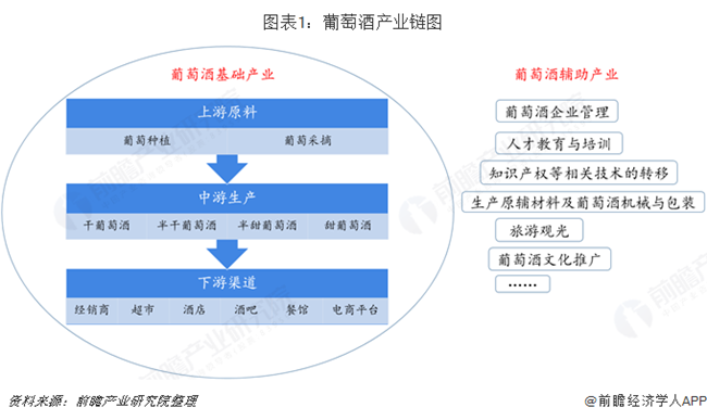葡萄酒行業(yè)所處的產(chǎn)業(yè)鏈?zhǔn)怯善咸逊N植者、葡萄酒生產(chǎn)者、消費(fèi)者、資源回收者等一系列利益相關(guān)者組成,通過自種釀酒葡萄或者收購(gòu)釀酒葡萄或葡萄原酒,對(duì)之進(jìn)行加工,之后銷售產(chǎn)成品。該系統(tǒng)以產(chǎn)區(qū)生態(tài)為條件,以葡萄種植為基礎(chǔ),以葡萄酒生產(chǎn)及其副產(chǎn)物資源利用為保證,涉及到相關(guān)的葡萄種植、葡萄酒釀造、葡萄酒包裝、零售賣場(chǎng)、餐飲行業(yè)、消費(fèi)者經(jīng)濟(jì)收入與消費(fèi)偏好等眾多環(huán)節(jié)。