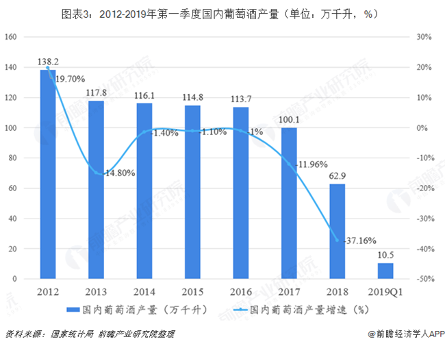 近幾年由于我國(guó)實(shí)行“三公”政策對(duì)葡萄酒行業(yè)發(fā)展造成一定負(fù)面影響,葡萄酒行業(yè)一直處于產(chǎn)業(yè)結(jié)構(gòu)調(diào)整時(shí)期。從國(guó)家統(tǒng)計(jì)局的數(shù)據(jù)看來,2012年我國(guó)葡萄酒產(chǎn)量一直處于下跌狀態(tài),2018年全國(guó)葡萄酒產(chǎn)量累計(jì)值為62.9萬千升,比2017年總產(chǎn)量的100.1萬千升減少了37.2萬千升,暴跌37.16%。