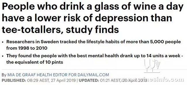 Daily Mail日前報(bào)道過這樣一則新聞:每天喝一杯葡萄酒,可以降低抑郁癥發(fā)生的風(fēng)險(xiǎn)。
