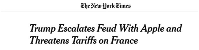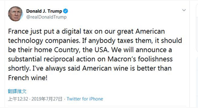 作為對(duì)法國(guó)近期宣布對(duì)全球科技巨頭征收數(shù)字服務(wù)稅的回應(yīng),據(jù)美國(guó)《紐約時(shí)報(bào)》報(bào)道,特朗普26日先是在推特上表示,“法國(guó)剛剛對(duì)我們偉大的美國(guó)科技公司征收一項(xiàng)數(shù)字稅,如果說有人要向他們征稅,那也應(yīng)該是他們的祖國(guó)——美國(guó)。”