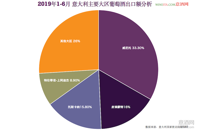 2019年上半年,意大利葡萄酒出口額最高的四個大區(qū)分別是威尼托(Veneto)大區(qū)、皮埃蒙特(Piemonte)大區(qū)、托斯卡納(Toscana)大區(qū)、和特倫蒂諾-上阿迪杰(Trentino-Alto Adige)大區(qū)。它們的葡萄酒出口總額接近23億歐元,占這段時間內(nèi)意大利葡萄酒總出口額的76%
