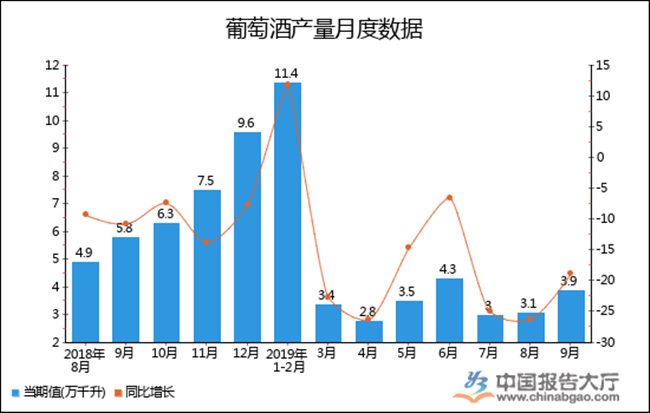 根據(jù)中國報告大廳對2019年1-9月全國葡萄酒產(chǎn)量進行監(jiān)測統(tǒng)計顯示:2019年9月全國葡萄酒產(chǎn)量3.9萬千升,同比下降18.8%,2019年1-9月全國葡萄酒產(chǎn)量為30.3萬千升,累計下降10.4%。