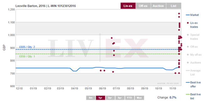 上周五,自巴頓Leoville Barton 2016年被Wine Spectator評為2019年度最佳葡萄酒后,此酒隨即出現一陣熱買和價格上漲。在幾個小時內,它的成交價更創(chuàng)歷史新高,高達1,166英鎊 (每箱12×75) 。