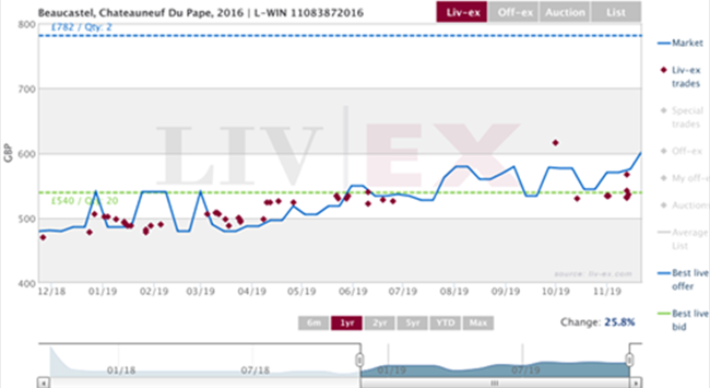 本周雖然情況稍為平靜,但巴頓2016年仍是交易焦點。此酒的最成交價為855英鎊(每箱12×75),比Wine Spectator宣布前的成交價漲了22%。 自此,它一直是最活躍的葡萄酒 -交易總值和數量均是最高。