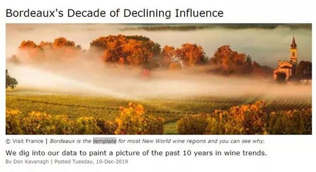 最近,葡萄酒搜索引擎“葡萄酒搜索器”(Wine-searcher)將其2019年的葡萄酒搜索數(shù)據(jù)與2010年的進(jìn)行了對比,并總結(jié)出數(shù)據(jù)的各種不同之處,發(fā)表題為《波爾多影響力衰退的十年》的文章。
