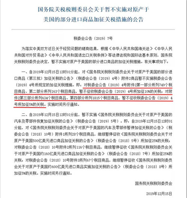 作為回應(yīng),中國將購買更多的美國農(nóng)產(chǎn)品,增加美國公司進(jìn)入中國市場的機(jī)會。因此,中國國務(wù)院關(guān)稅稅改委員會發(fā)布公告,將暫停實施原計劃于 2019 年 12 月 15 日 12 時 01 分起實施的《國務(wù)院關(guān)稅稅則委員會關(guān)于對原產(chǎn)于美國的部分進(jìn)口商品(第 3 批)加征關(guān)稅的公告》加征關(guān)稅措施。具體政策如下: