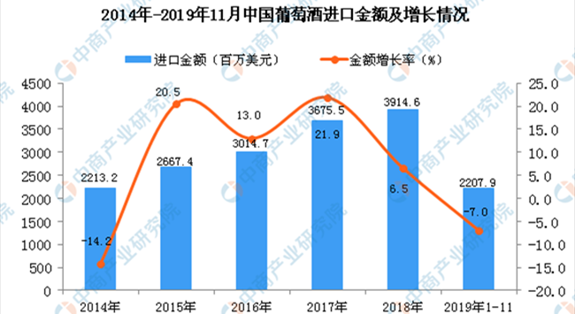 從金額方面來看,2019年1-11月中國葡萄酒進(jìn)口金額為2207.9百萬美元,同比下降7%。