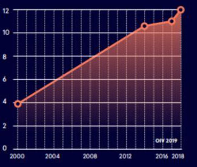 2000年至2018年的中國的紅酒葡萄種植園占世界的比重,如下圖所示,一直說在快速的增加過程中。