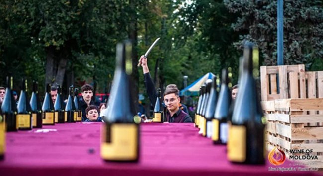附加信息:摩爾多瓦侍酒師Daniel Frumusachi最近表演了“砍香檳”特技,被載入了吉尼斯世界紀錄。9月19日,他的第一項紀錄被吉尼斯世界紀錄認證(他在30秒內(nèi)打開了49瓶酒),他正在等待第二項紀錄的認證:在1分鐘內(nèi)打開了79瓶酒(上一次記錄是由Raimond Thomson創(chuàng)造,1分鐘內(nèi)打開了71瓶酒)。圖為在國家葡萄酒節(jié)上,他在葡萄酒大師班上表演的“砍香檳”特技。