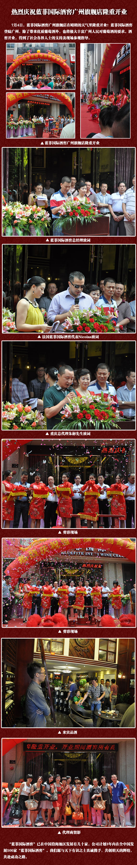 7月4日,藍(lán)菲國(guó)際酒窖廣州旗艦店在晴朗的天氣里隆重開(kāi)業(yè)!藍(lán)菲國(guó)際酒窖登陸廣州,除了帶來(lái)優(yōu)質(zhì)葡萄酒外,也將極大豐富廣州人民對(duì)葡萄酒的要求。酒窖開(kāi)業(yè),得到了社會(huì)各界人士的支持及現(xiàn)場(chǎng)參觀指導(dǎo)。
